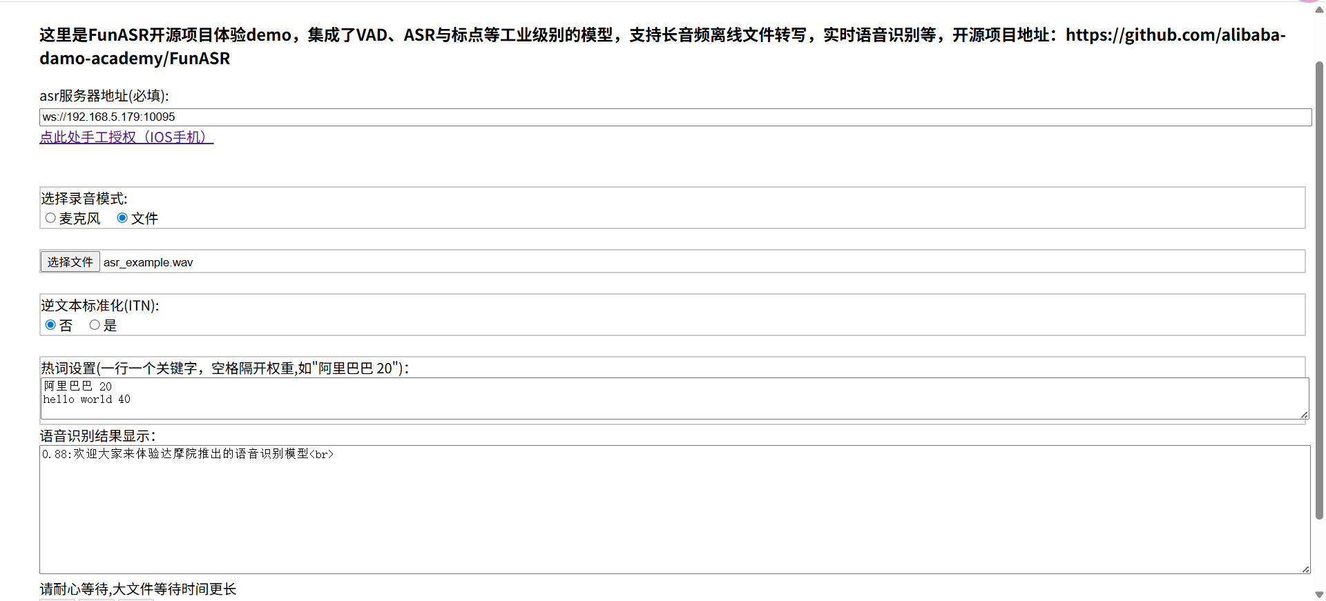 # 如果您想在服务端加载热词,请在宿主机文件./funasr-runtime-resources/models/hotwords.txt配置热词(docker映射地址为/workspace/models/hotwords.txt):